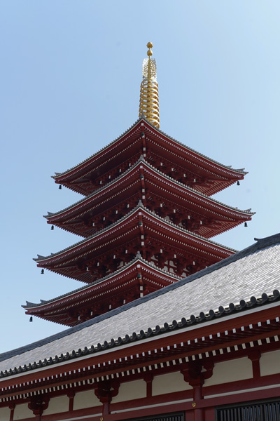 Arrivez à la Hōzōmon, vous entrez maintenant dans l’enceinte principale du Sensō-ji : face à vous le bâtiment où se trouve la fameuse salle de la déesse, sur le côté la pagode à cinq étages, et un peu plus loin un petit jardin où se trouve un vieux pont nommé Ishibashi.