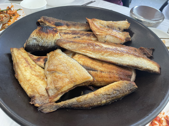 - 속초생생구이 à Sokcho : un restaurant de poissons grillés qui ne paye pas de mine mais où nous nous sommes régalés. Nous avons pris un grand plat de poissons du moment à partager pour 3 personnes, un plat individuel pour la 4ème voyageuse, et une bière, pour un total de 45 euros. J’ai rarement mangé du si bon poisson !