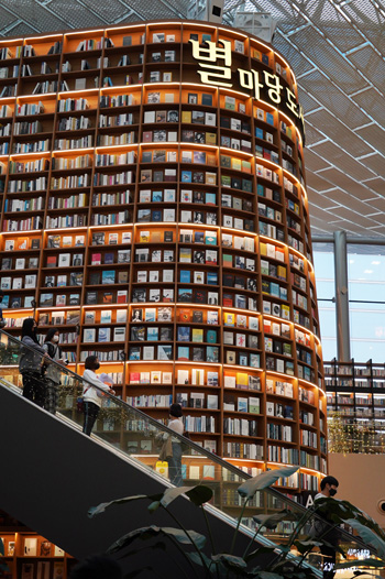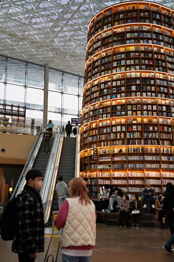 Placés l’un face à l’autre, il est particulièrement troublant de voir ces deux lieux se faire face. D’un côté l’un des plus grands temples bouddhistes de Séoul (où l’on peut participer au programme Temple Stay dont je vous parle dans mon article dédié au temple Guinsa), et de l’autre un immense centre commercial où se dresse la vertigineuse Starfield Library (en photos ci-dessous).