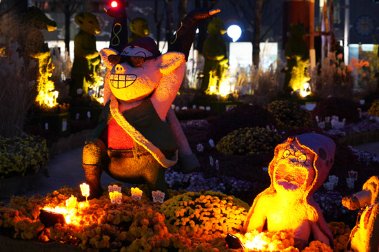 Si le temple nous avait marqué par la taille de son bâtiment principal plutôt imposant, et posé là, entre les buildings de la capitale, ce sont cette fois-ci les illuminations qui nous ont attirés : les belles statues et les aménagements fleuris et lumineux invitent à la découverte, toujours amusante par le décalage créé entre le temple et son environnement.