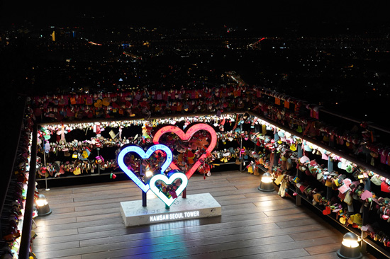 Cette fois-ci, nous avons pris le téléphérique (10 euros A/R) en fin de journée pour assister au coucher du soleil depuis la tour. Si vous souhaitez faire la même chose, soyez plus prévenants que nous : à 17h, le téléphérique est blindé, et la N Seoul Tower également !