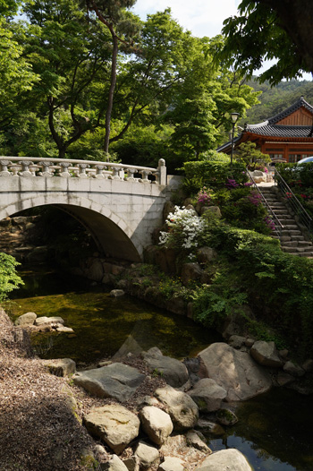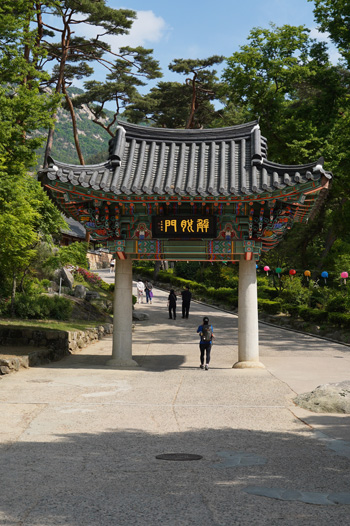Le chemin, pentu, offre de multiples possibilités avec sur la gauche le temple, sur la droite un espace arboré en bord d’eau où se poser, et tout droit une randonnée vers la vallée, à l’entrée du Mont Bukhan. Il s’agit d’ailleurs du point de départ du parcours de randonnée menant au pic Hyangnobong.
