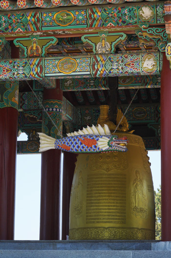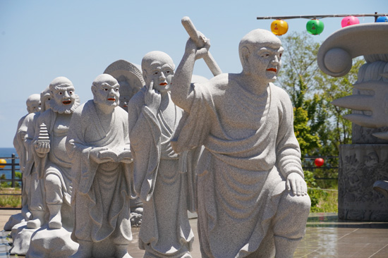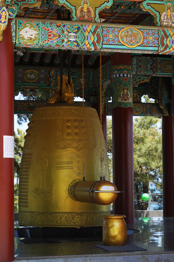 D’abord on découvre différents bâtiments typiques des temples coréens, ensuite on arrive à une plateforme où se trouvent les statues ainsi qu’une magnifique cloche dorée, puis on descend jusqu’à la mer. Lors de notre passage, le vent frappait et l’eau était déchainée, ce qui offrait un spectacle très puissant.