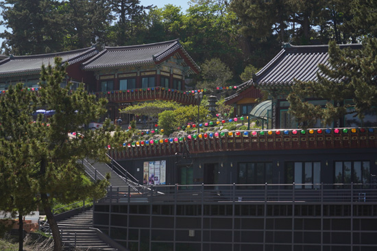 Construit à flanc de falaise, le Hyuhyuam Hermitage est composé de différentes parties, de la porte Iljumun jusqu’au bord de l’eau.