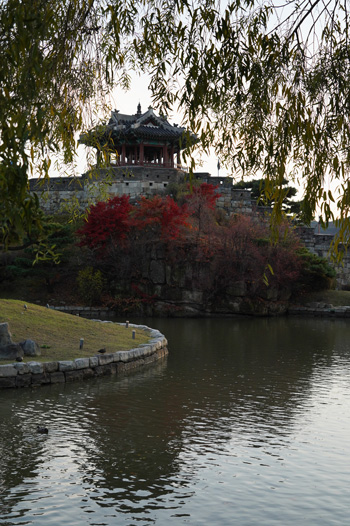 Nous n’avions pas le temps nécessaire pour en faire le tour, alors nous nous sommes contentés d’un court parcours avec depuis la porte Hwaseo jusqu’au pavillon Banghwasuryujeong, en passant par la porte Janganmun. Mais dans notre « malheur » (si l’on peut utiliser ce mot…) nous avons eu une incroyable chance : un couché de soleil magnifique, avec un ciel dégagé et un temps des plus agréable.