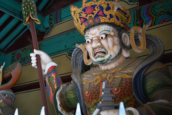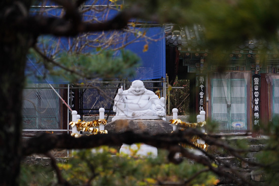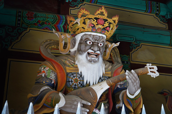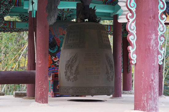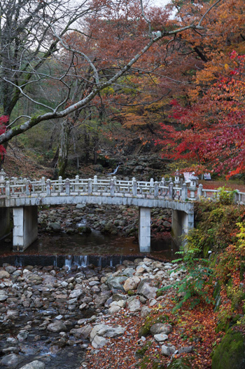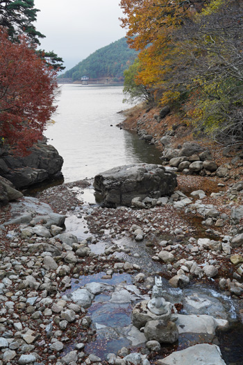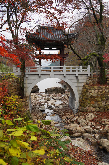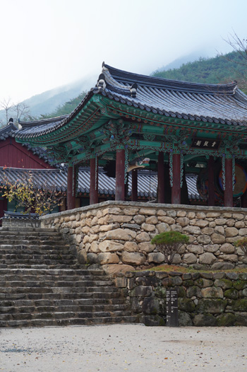On commence la visite du temple Cheoneunsa par traverser un grand espace menant à la porte Iljumun, avant d’atteindre un petit pont surplombant le ruisseau qui se déverse dans le lac. Après l’avoir traversé, on tombe nez à nez avec de grands escaliers blancs menant à la cour principale du complexe.