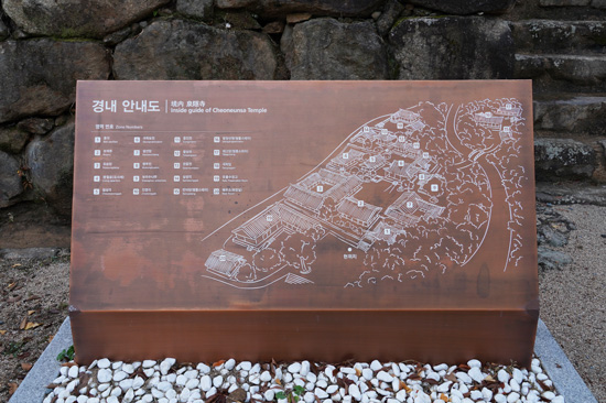 Le temple Cheoneunsa est également le point de départ de plusieurs randonnées, dont l’une qui fait le tour du lac qu’il borde. Différents panneaux indiquent les chemins possibles.