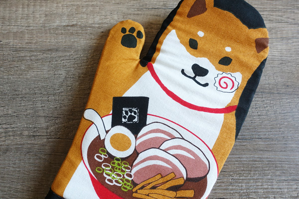 - Un gant de cuisine mettant en scène un shiba présentant fièrement son ramen.