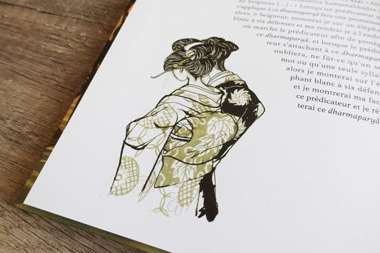 Il faut dire que sa couverture m’a tout de suite tapé dans l’œil. Ce Kitsune qui se pavane dans son magnifique kimono semblant voler au dessus de ce marécage féérique m’interpelle. Nous sommes tous sensibles à différentes choses, et moi il m’a suffit de cette illustration pour m’éveiller aux traits de Benjamin Lacombe. Mais une belle couverture ne garanti pas forcément un bon ouvrage… Concrètement, que trouve t-on dans Esprits & Créatures du Japon qui en fait une si belle réussite à mes yeux ?