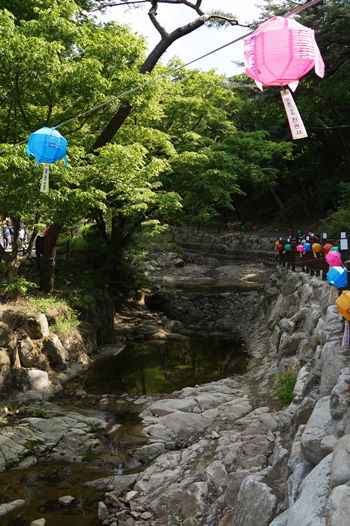 Le chemin, pentu, offre de multiples possibilités avec sur la gauche le temple, sur la droite un espace arboré en bord d’eau où se poser, et tout droit une randonnée vers la vallée, à l’entrée du Mont Bukhan. Il s’agit d’ailleurs du point de départ du parcours de randonnée menant au pic Hyangnobong.