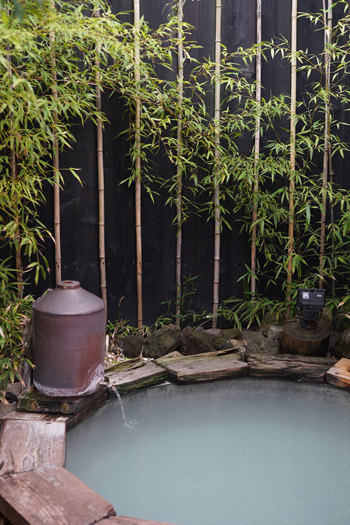 Le onsen en extérieur était alimenté par un petit robinet d’où coulait doucement l’eau, placé sur une terrasse en bois avec vue sur un petit jardin de galet.