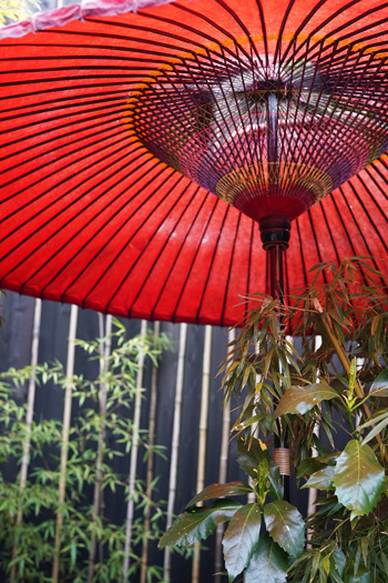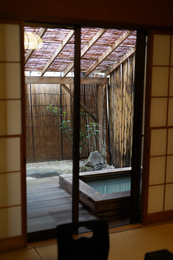 La chambre de notre ryokan était composée d’un espace central avec une table donnant sur le jardin via une baie-vitrée. Dans le jardin il y avait une salle de bain extérieure (pommeau de douche et petit tabouret typique d’une salle de bain japonaise) et un onsen privé ; et nous avions des toilettes privées.