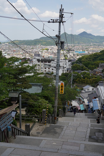 Konpira Omotesando, le point de départ de la longue ascension du sanctuaire Konpira-san, est une grande allée à demie-couverte bordée de nombreux magasins et restaurants. À peine nous commençons à nous enfoncer dans cette allée que nous nous retrouverons face à de larges marches dont on ne voit pas le bout : nous voici partis pour grimper les 365 premières marches.