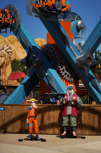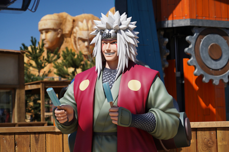 À l’entrée, nous accueillent Naruto et Jiraya, ainsi que la première attraction : le Rasengan Chakra Rotation.