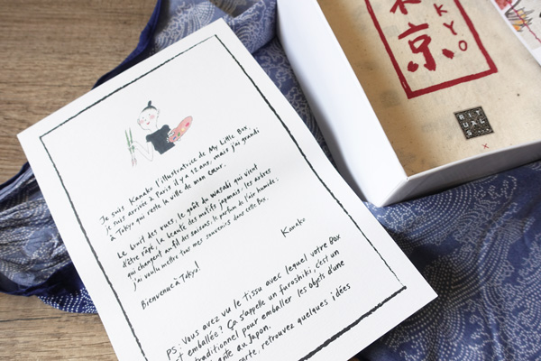 Passons à l’ouverture de la box. On tombe tout d’abord face à un petit mot de Kanako, l’illustratrice de My Little Box, qui est japonaise. Elle partage avec nous ses sentiments pour Tokyo, ville qui la vue grandir, et nous informe qu’elle a souhaité nous partager tous ses souvenirs dans cette box.