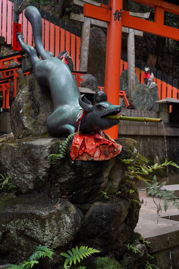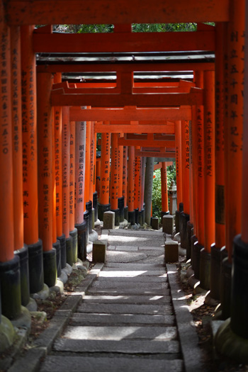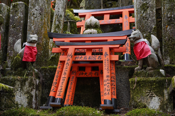Principal sanctuaire du Japon dédié à la déesse Inari, associée à la fertilité et à la moisson, le Fushimi Inari est un des lieux les plus connus du pays à l’étranger. Inari, de son nom signifiant « Croissance du riz » envoient sur Terre des messagers sous la forme de renard (Kistune).