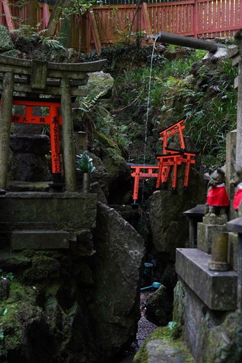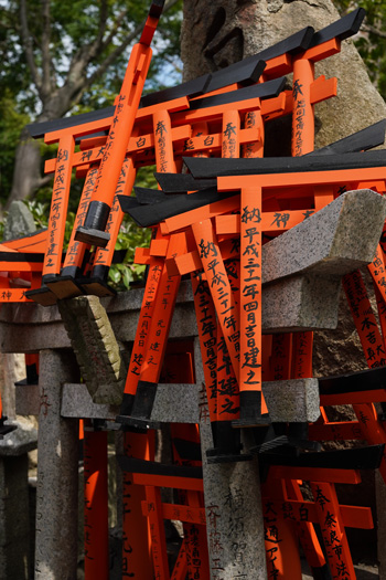 En ce qui concerne les torii du Fushimi Inari, l’explication de leur présence n’est pas toujours si mystique : si certains sont des dons de fidèles, d’autres ne sont que des panneaux publicitaires pour de grands groupes ou de riches hommes d’affaires ; car, en effet, ce sont les noms des donateurs que vous voyez inscrits sur les différents torii.