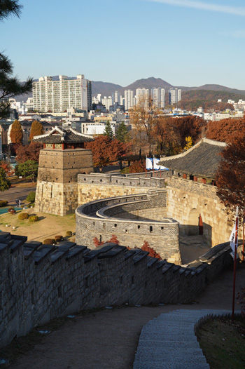 Étendue sur presque 6km, la forteresse de Hwaseong est composé de plusieurs portes, dont la plus emblématique Changryongmun à l’est de la forteresse, de tours de guet, de postes de commandes et d’autres constructions à visée défensive.
