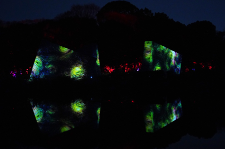 Tout se passe en extérieur, et de nuit : le chemin, que l’on suit dans un sens prédéfini, traverse différentes zones à thème. Si certaines œuvres sont permanentes, comme les œufs lumineux du jardin de camélias ou les lampes flottantes sur le lac Oike, d’autres sont saisonnières. Vous l’aurez donc compris : chaque visite est différente !
