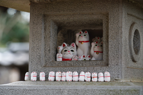 Ici, au temple Gotokuji, on ne compte plus les statues de maneki neko qui s’y trouvent. Les visiteurs y viennent acheter leur maneki neko, et les déposer parmi tous les autres après avoir fait leur vœu d’avenir.