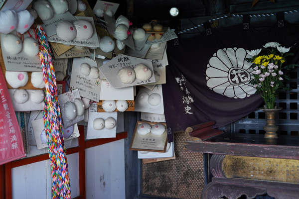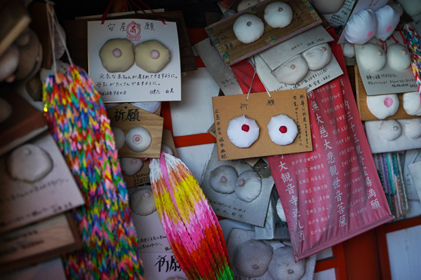 Ensuite, par son culte : le temple Bandaiji Kannon-do est dédié à la fertilité et à la grossesse, pour tomber enceinte et avoir un accouchement sans risque. De ce fait, on retrouve sur tous les ema du temple (les plaquettes de vœux japonaises) des poitrines. Sur le coup, quand on ne connait pas le culte du temple, il faut avouer que c’est assez étonnant !