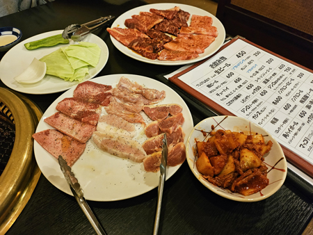 - Yakiniku Fumino Ya à Fukuoka : ce petit restaurant situé juste derrière notre premier logement fut une bien belle surprise. Ici, pas de menu en anglais, des tables horigotatsu (vous savez, ces tables avec une niche dans le sol) et une atmosphère rétro. Un yakiniku dans une ambiance « tradi ». Là, le budget fut plus élevé. Pour cause : du délicieux wagyu à faire cuire sur la table chauffante au centre de la table. Nous en avons eu pour 40 euros à 2, en ayant pris plusieurs morceaux de viande (dont des nobles) ainsi qu’un highball et un saké.