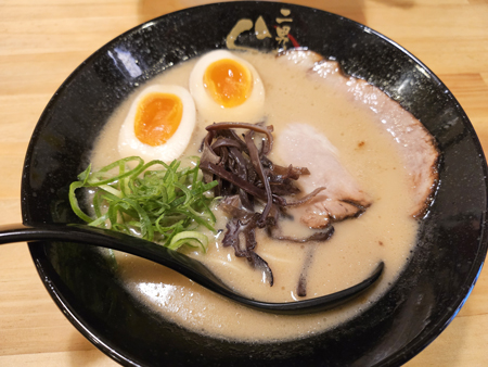 - Menya Show à Karatsu : deuxième ramen de cette sélection, mais il mérite clairement sa place ici. Bien différent du premier, les deux se battent pour le titre du meilleur du séjour ; mais ils sont si différents qu’il m’est impossible de trancher. Si vous passez par Karatsu, je vous le recommande vivement. Comptez 18,5 euros pour deux ramen, un bol de riz chiar su, des gyoza et une bière.