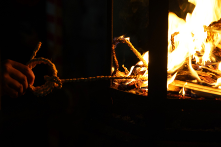 L’Okera Mairi est propre au Yasaka-jinja et c’est justement ce qui nous a attiré. Cette tradition consiste à faire brûler des racines d’okera, une herbe médicinale, pour alimenter un feu sacré qui chasse les mauvaises énergies de l’année passée et dans lequel les visiteurs viennent allumer une petite corde.