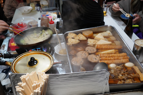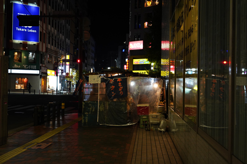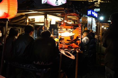 Nous avons ainsi dégusté un très bon tonkotsu accompagné d’un assortiment d’oden dans un premier yatai, puis du mentaiko, un autre tonkotsu et des boulettes de poulet dans le second, avant de nous diriger vers un troisième yatai qui semblait spécialisé dans le poisson. Ce dernier nous a paru un peu particulier : il n’y avait qu’un seul couple qui y attendait, et l’ambiance avait l’air plus intime que dans les autres yatai, le comptoir et ses visiteurs étant entièrement cachés derrière une bâche.