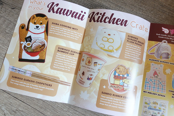 En ouvrant la Doki Doki on tombe tout de suite sur le petit dépliant de la box. Le dessin style manga est une création originale pour la Doki Doki mettant en scène certains articles de la box. Dans ce dépliant on retrouve la présentation des différents produits, ainsi que la liste des cadeaux du mois (chaque mois, un abonné tiré au hasard reçoit tout un tas de produits supplémentaires).