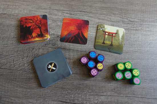 • 3 types de tuiles différents : volcan, paysage ou village. Les tuiles volcans sont les 3 tuiles de départ, elles représentent Fujisan en éruption et la lave qui s’en échappe. Les tuiles paysages sont les tuiles qui vont constituer le parcours des joueurs. Sur le recto on y trouve un paysage avec une condition d’accès (exemple : « Dés bleu de valeurs impaires »), et sur le verso on y voit la lave du volcan. Et enfin, les tuiles villages sont les tuiles qu’il faut que l’ensemble de l’équipe ait atteins pour gagner la partie. Comme les tuiles paysages, on y trouve une condition d’accès qui leur ait propre (exemple : « Dés jaune de valeur 6 »).