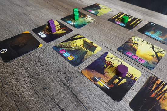 En d’autres termes : si la condition d’accès de la tuile sur laquelle je souhaite aller est « Dés jaunes de valeur 3 », il faut que le total de mes dés, qui remplissent la condition, soit supérieur à celui de mes compagnons. Si j’en possède 3, j’ai un score de 9 : 3 (nombre de dés qui rempli la condition) x 3 (valeur du dés) ; mais si l’un de mes compagnons en a 4, il a un score de 12 : 4 (nombre de dés) x 3 (valeur du dés). Dans ce cas-là, je ne peux pas rejoindre la tuile visée, donc je n’avance pas.