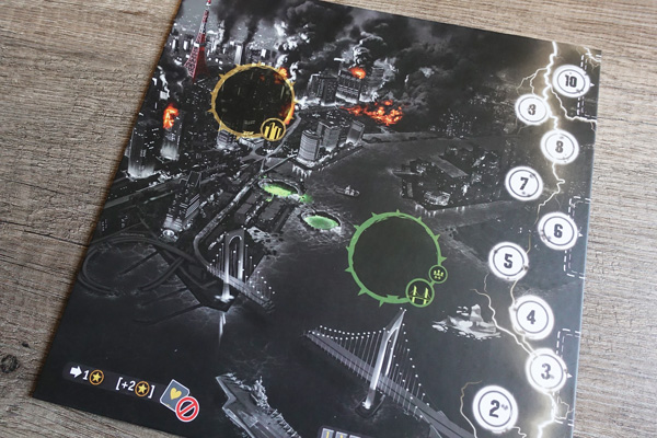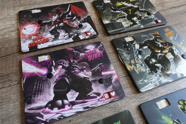 • 6 kaijū, 6 fiches personnages et 6 jetons monstres associés : le kaijū se place sur le plateau, la fiche personnage face à soi et le jeton monstre sur la jauge de méchanceté. Sur la fiche personnage on trouve nos points de vie et nos points de victoire (que l’on peut baisser et augmenter grâce à une petite molette).