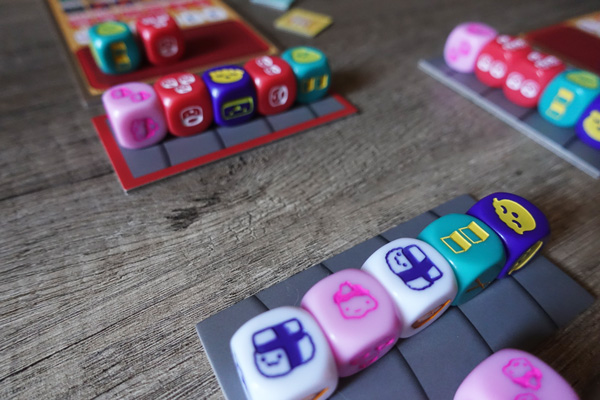 Une fois l’ensemble des dés récupéré, on lance tous ensemble nos dés, on les place sur notre tapis roulant et on en choisit un. Après avoir choisi un seul de ces dés, on fait glisser notre tapis roulant devant le joueur à notre gauche, et on récupère le tapis du joueur à notre droite. Vous l’aurez donc compris : les dés changent continuellement de mains !