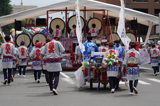 Les chars apparaissent petit à petit au loin. Chacun est précédé et suivi de différents groupes : certains jouent des instruments, d’autres se déguisent et interagissent avec les spectateurs et puis… une grande partie marche en bande de potes, la bière à la main, suivant un fut posé une table à roulettes ! Nous qui n’avions assisté qu’à des matsuri dansant et chantant jusque-là, on a trouvé très drôle de voir ce défilé mélangeant chars, musiques et marcheurs qui picolent.