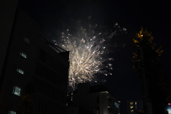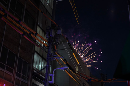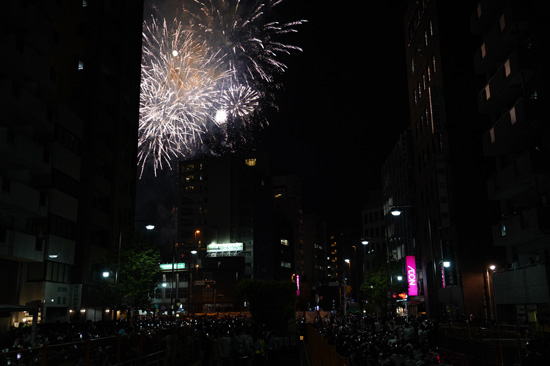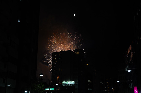 On comprend alors à ce moment-là que ça s’annonce compliqué : impossible de traverser la rivière Sumida, d’atteindre le pont ou de descendre sur les berges. Nous sommes arrêtés là plus d’une heure avant que la circulation reprenne. On se remet alors à avancer, doucement et difficilement, mais on avance. Le feu d’artifice débute avec plusieurs dizaines de minutes de retard : on ne voit rien, les illuminations étant cachées par les bâtiments.