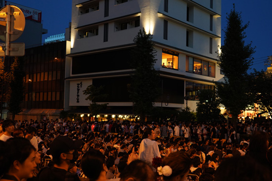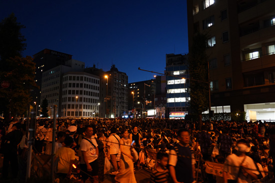 Nous sommes partis de notre hôtel, l’APA Hotel Asakusa Tawaramachi Ekimae situé à quelques pas de la rivière Sumida, vers 18h pour un lancement annoncé à 19h. La grande avenue Asakusa-dori, fermée à la circulation, est entièrement à la merci des piétons. On se dirige doucement vers la Sumida, mais nous sommes loin, très loin, d’être seuls. Au plus on se rapproche, au plus la foule est grande. Arrivés au carrefour qui fait face au pont Komagata, on est arrêtés : des barrières sont érigées de toutes parts, et des véhicules de police répètent en boucle la même phrase terminant par le fameux « kudasai », des consignes sans doute pertinentes et intéressantes, mais incompréhensibles pour nous.