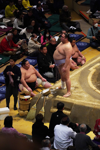 Parmi eux, ceux qui m’ont le plus marqué sont la purification au sel (les lutteurs lancent des poignées de sel sur le dohyō afin de le purifier), les intimidations (chacun tente de déstabiliser l’autre avant le combat en montrant ses capacités, par exemple avec les levées de jambe), et le tachi-ai qui est le lancement du combat, dès lors que les deux touchent le sol avec leurs poings. Ce qui étonne ici, c’est que lors d’une rencontre entre deux sumotoris, ces rituels prennent plus de place et durent bien plus longtemps que le combat en lui-même !
